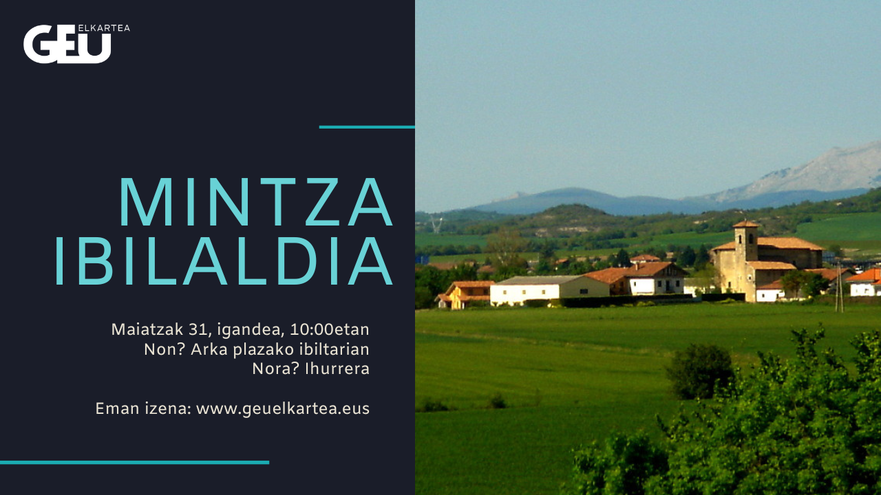 Arka plazako ibiltaria Eduardo dato kalea, 17, VitoriaHilean behin eta igandeetan, mintzalagunok 2 ordutako ibilaldiak egiten ditugu Gasteiz inguruetan. Non? Arka plazako ibiltaritik Nora? Ihurrera Noiz? Maiatzaren 31n, igandea, 10:00etatik...