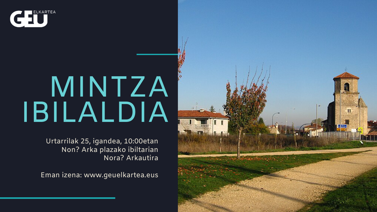 Arka plazako ibiltaria Eduardo dato kalea, 17, VitoriaHilean behin eta igandeetan, mintzalagunok 2 ordutako ibilaldiak egiten ditugu Gasteiz inguruetan. Non? Arka plazako ibiltaritik Nora? Arkautira Noiz? Urtarrilaren 25ean, igandea, 10:00etatik...