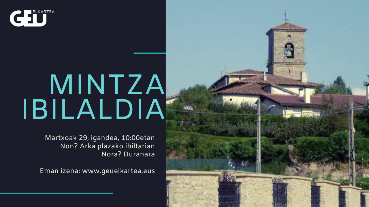 Arka plazako ibiltaria Eduardo dato kalea, 17, VitoriaHilean behin eta igandeetan, mintzalagunok 2 ordutako ibilaldiak egiten ditugu Gasteiz inguruetan. Non? Arka plazako ibiltaritik Nora? Duranara Noiz? Martxoaren 29an, igandea, 10:00etatik...